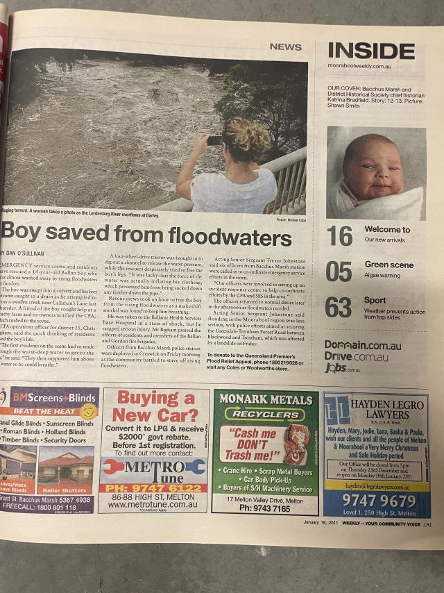 Emergency service crews and residents have rescued a 14-year-old Ballan boy who was almost washed away by rising floodwaters in Gordon.